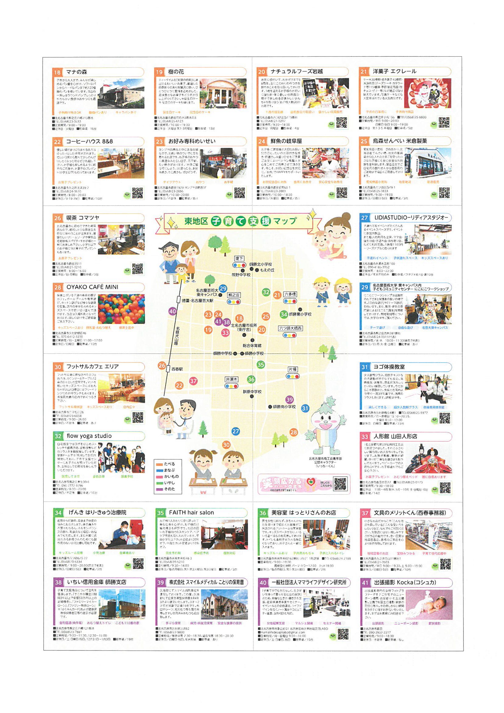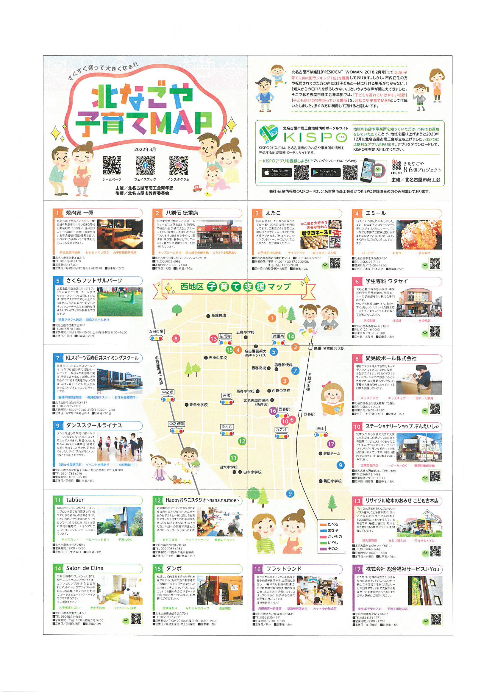 地域の魅力発信を目的に、北名古屋市内の事業所に協力を仰ぎ「子どもを連れていきやすい場所」、「子ども向けの商品を取り扱っている場所」をテーマに41事業所を掲載したA2サイズの折りたたみMAPを作成しました。 |